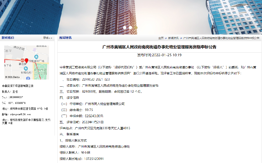 廣州市黃埔區(qū)人民政府南崗街道辦事處物業(yè)管理服務(wù)資格中標(biāo)公告